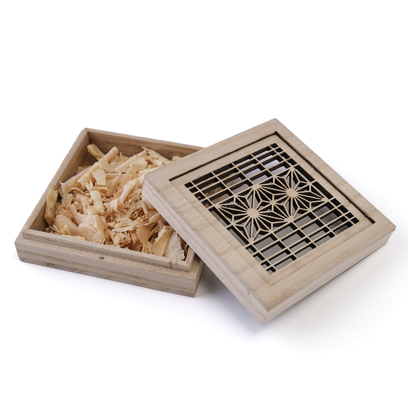 Die dekorative Holzbox ist mit Zirbenholzspänen gefüllt, die mit einigen Tropfen ätherischen Öls beträufelt werden. Sie hat einen losen Deckel mit einem klassischen japanischen Kumikoh-Muster, durch den der angenehm waldige Duft der Zirbelkiefer sanft verströmt.