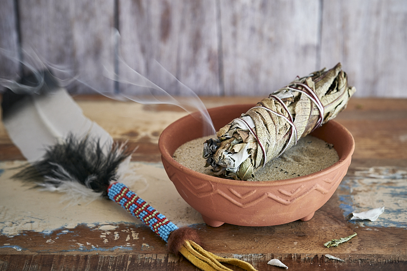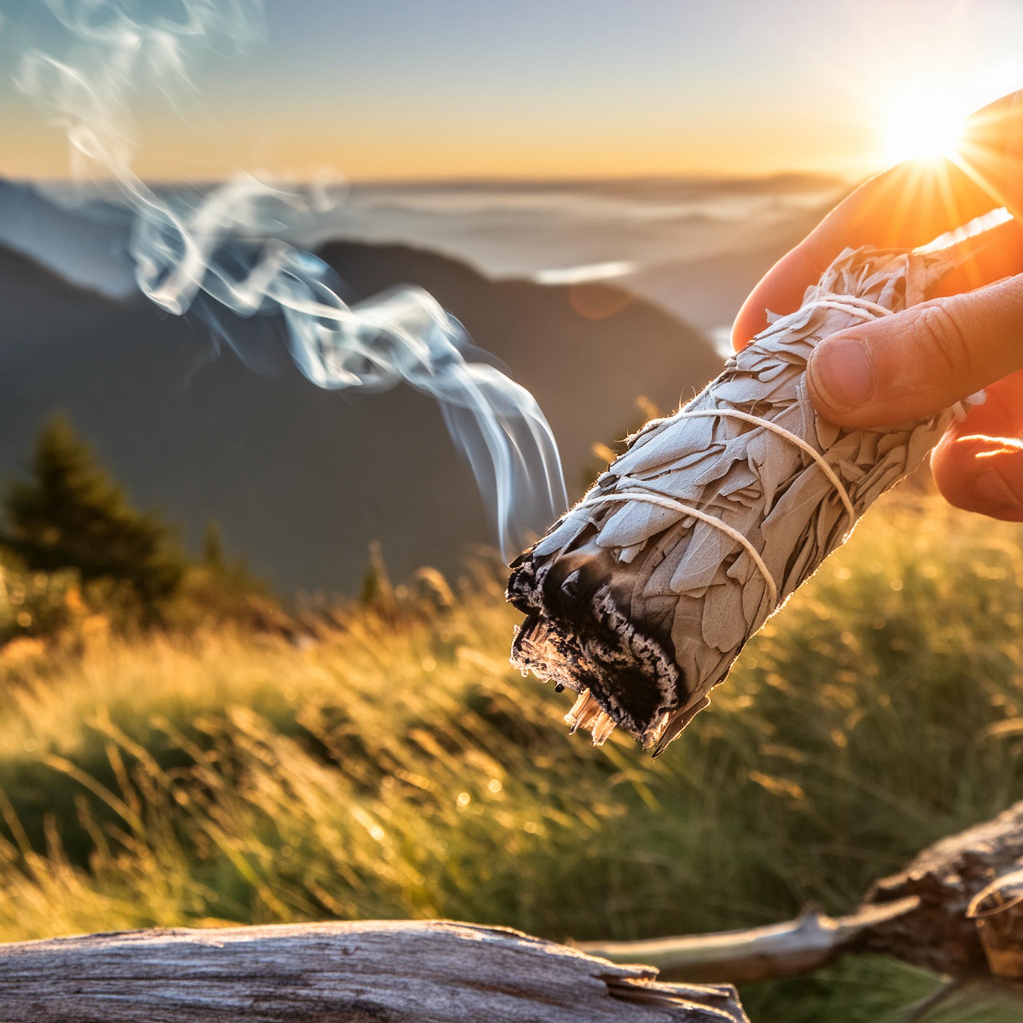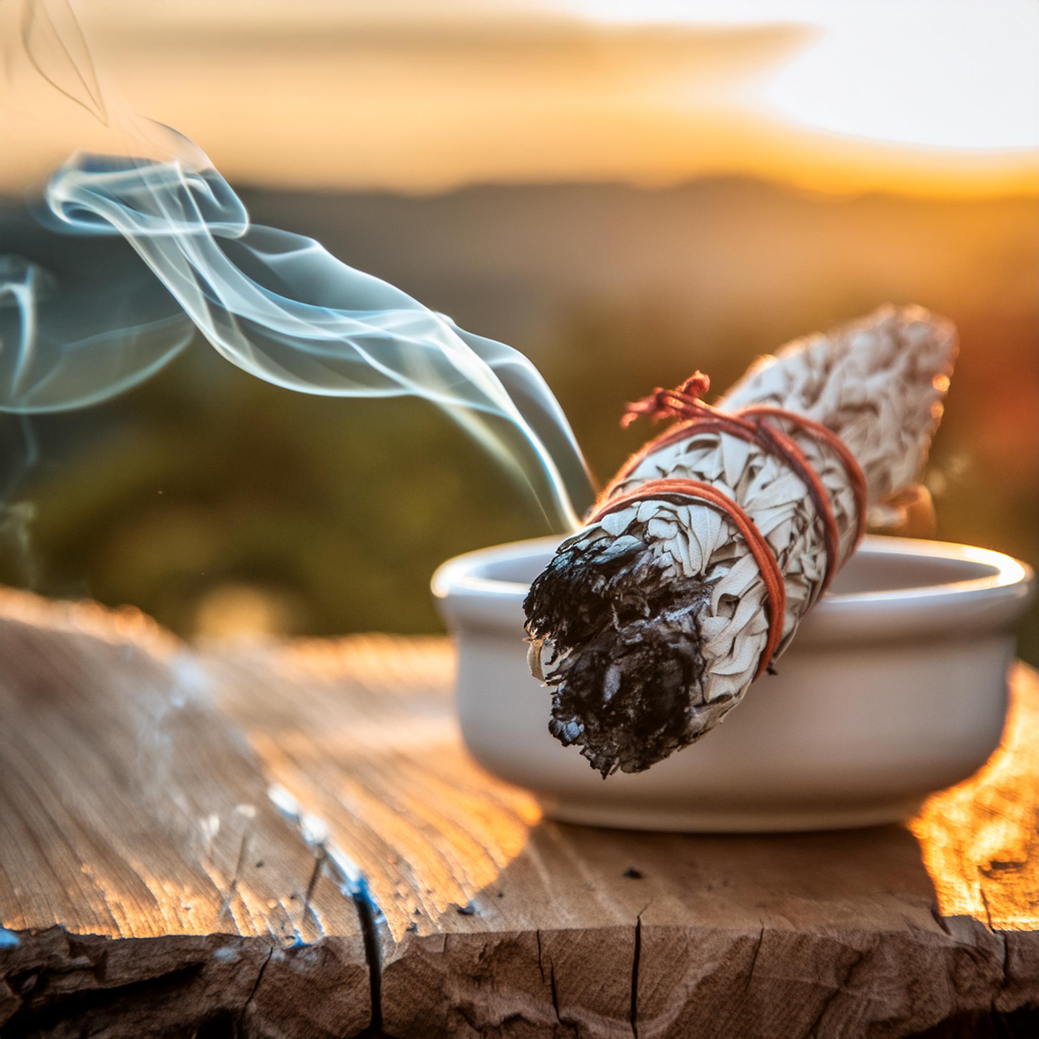 - mit Kräuterbündeln und Smudge Sticks (White Sage)