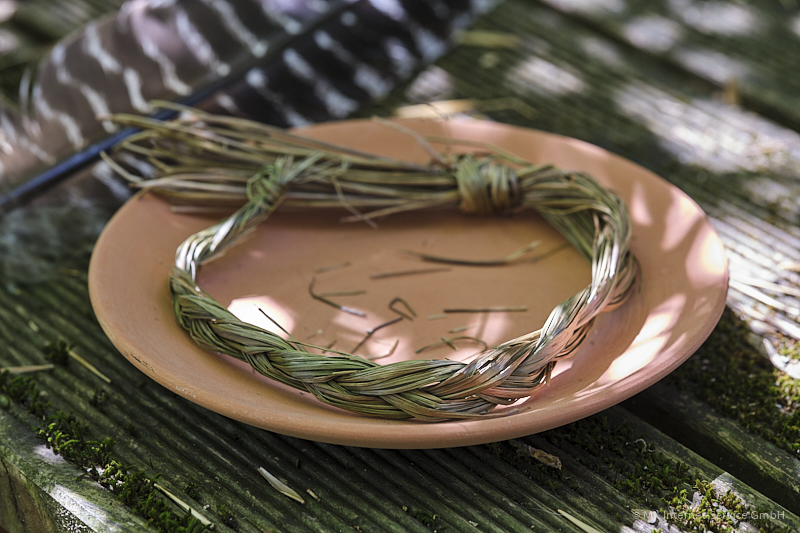 Sweetgrass wird zu einem Zopf (englisch „braid“) geflochten und getrocknet. Es wird darauf geachtet, dass die Pflanze respektvoll gesammelt und verarbeitet wird, oft in Übereinstimmung mit traditionellen Geboten.