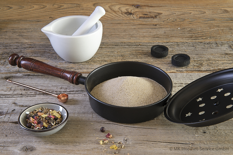 ![]() | 2. Räuchergefäß vorbereiten: Fülle das Räuchergefäß zu etwa ¾ mit Feuersand (mind. zwei bis drei Zentimeter hoch). Der Feuersand dient als Unterlage für die Räucherkohle und wirkt isolierend gegen die Hitze. Das Gefäß bleibt sauber und ist einfacher zu reinigen. | |