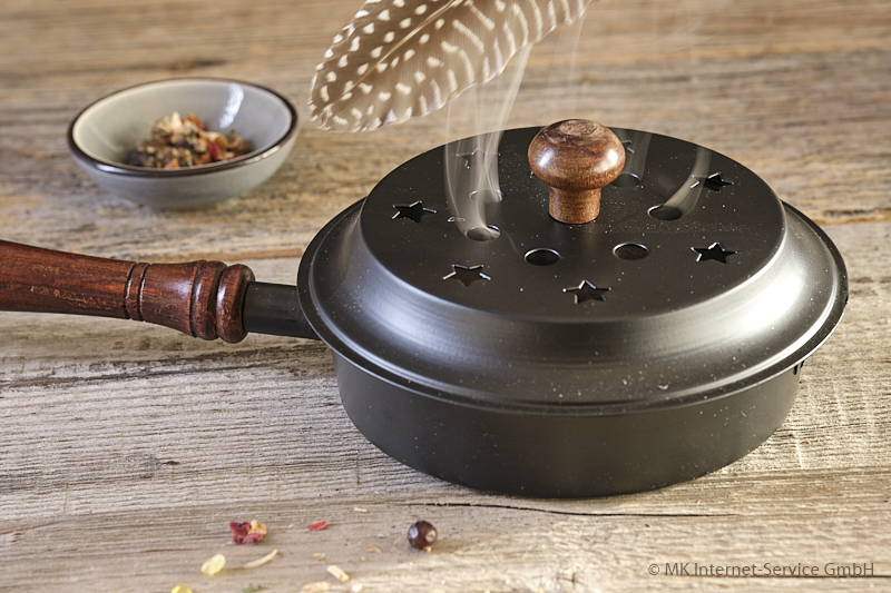 Bei dieser Räucherung haben wir eine Räucherpfanne mit Holzgriff verwendet. Diese ist ideal, wenn Du bei der Räucherung mit deinem Räuchergefäß herumlaufen möchtest, zum Beispiel wenn du bei einer Hausreinigung von Raum zu Raum gehst. Der Holzgriff nimmt die Hitze nicht an und die Pfanne kann am Griff sicher herumgetragen werden.