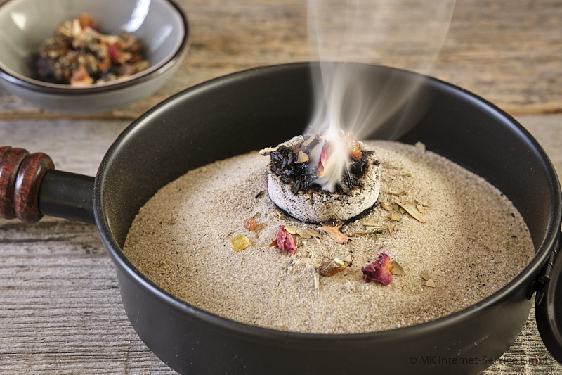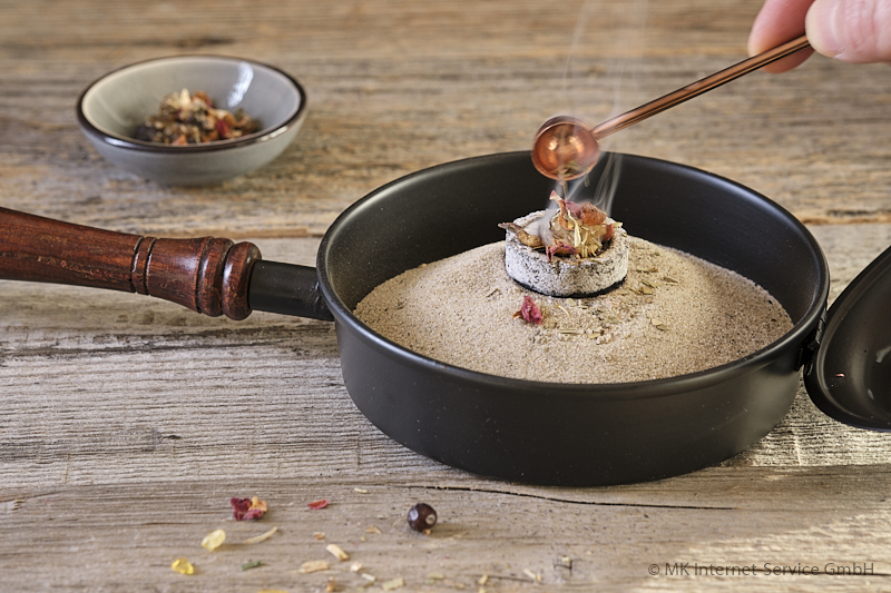 | 5. Die Räucherung: Wenn die Kohle einen weißen Ascheüberzug hat, kannst du mit deiner Räucherung beginnen. Streue zunächst eine kleine Menge Sand (ca. ein Räucherlöffel) in die Vertiefung auf die Kohle, bevor du das Räucherwerk auflegst. Dieses verbrennt dann nicht so schnell. Nach dem Räuchern solltest du die Fenster öffnen, damit die losgelösten alten Energien nach draußen ziehen können. |