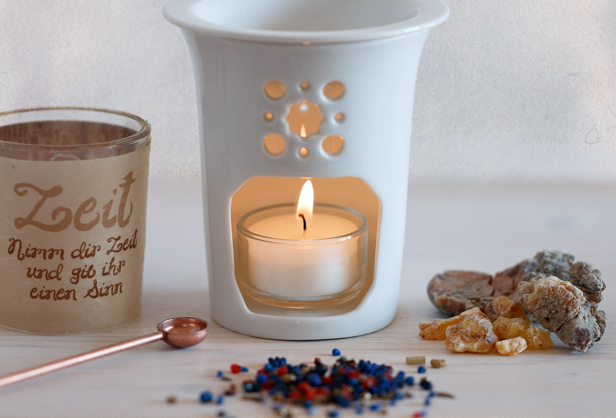 Eine andere Möglichkeit bietet unsere Duftlampe Geo. Die Schale der Duftlampe wird mit Wasser gefüllt. Sobald das Wasser zu dampfen beginnt, fügen Sie ein paar Körnchen Harz oder andere Aromate hinzu und bald verbreitet sich ein angenehmer Duft im Raum.