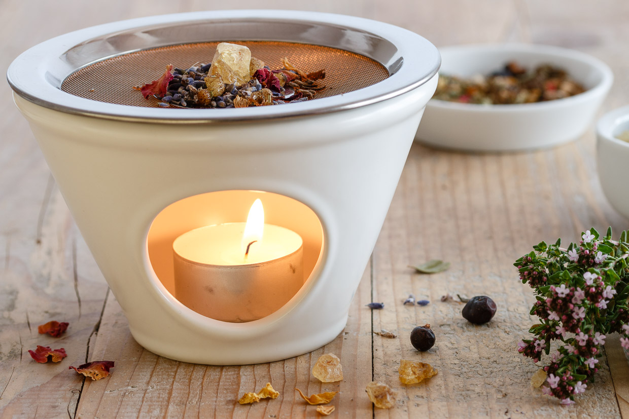 Das Räuchern ohne Kohle wird immer beliebter. Räucherstövchen sind eine gute Alternative zum Räuchern auf Kohle und besonders geeignet, um Räucherwerk wie Kräuter, Blüten, Harze und Hölzer sanft verglühen zu lassen. Nach dem Prinzip der Aromalampe werden die Räucherstoffe auf ein feinmaschiges Sieb gelegt, unter dem ein Teelicht brennt, und können dann ganz langsam verglimmen und ihren feinen Duft verströmen.