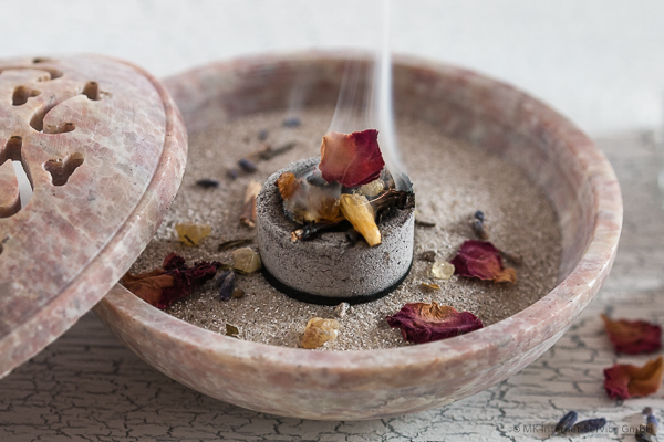 Tipp: Räucherkohle wird sehr heiß. Damit das Räucherwerk nicht so schnell verglüht, streut einfach ein wenig Feuersand auf die durchgeglühte Kohle, bevor ihr das Räucherwerk auflegt.