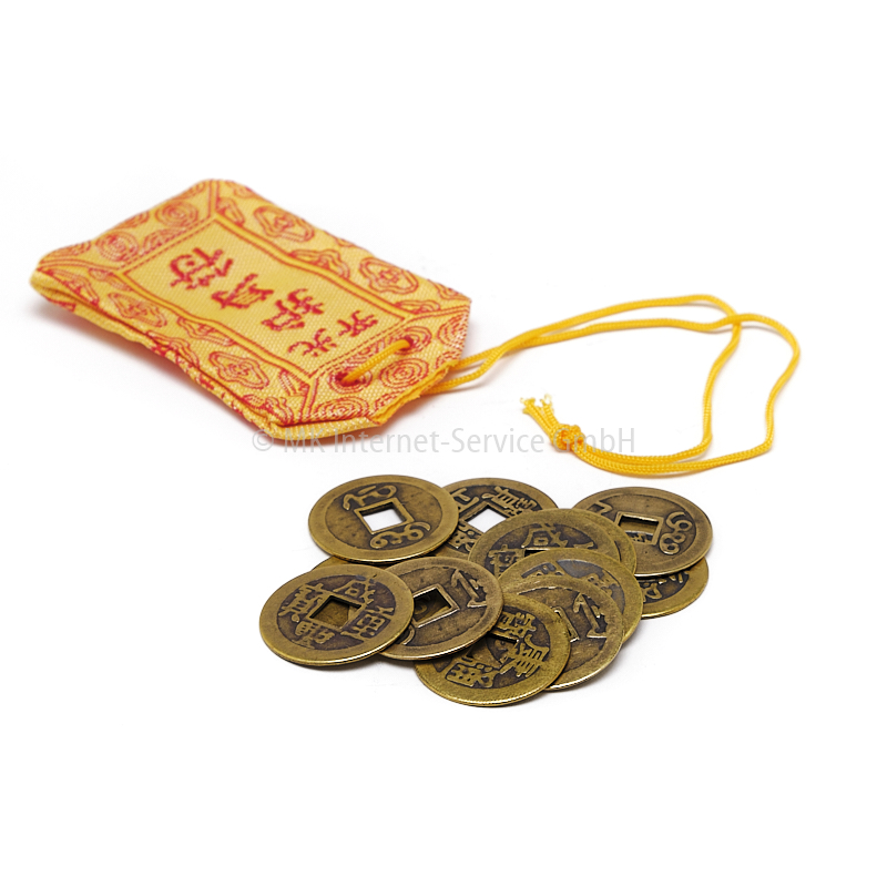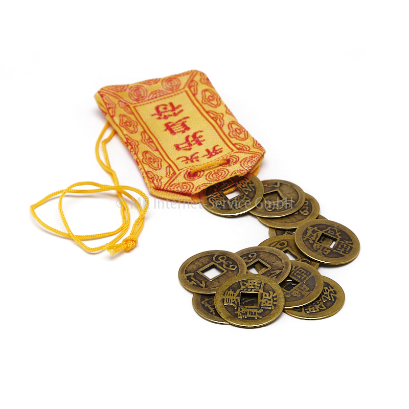 Set mit 12 losen Münzen im Baumwollsäckchen. Man kann sie einzeln z. B. in die Geldbörse zur Geldvermehrung stecken oder auch kreativ auf die gewünschte Anzahl zusammenbinden. Auch beliebt als Talisman in der Jackentasche, im Auto oder als Kette.