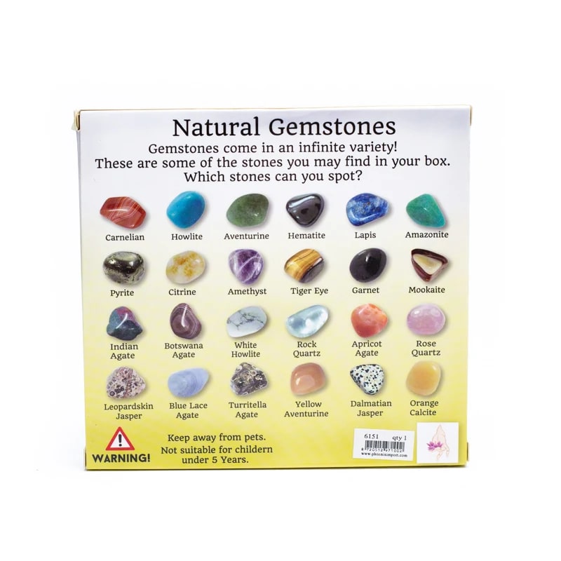 Geschenkbox mit 20 sortierten Trommelsteinen wie Tigerauge, Karneol, Lapis, Amazonit, Rosenquarz, Pyrit, Dalmatiner Jaspis, Aventurin, Citrin (gebrannter Amethyst) u. v. m.