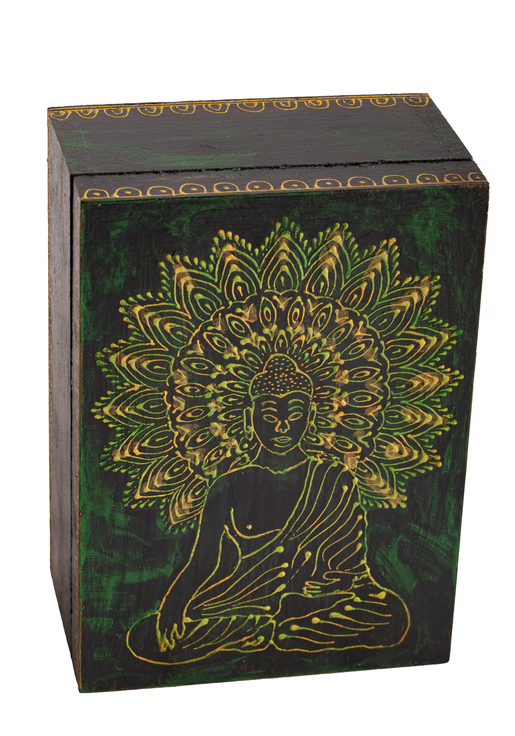 Schöne Holzbox für alle besonderen Dinge und kleinen Geheimnisse. Buddha schützt in Ruhe und Verschwiegenheit alle anvertrauten Dinge. Zugleich wird er mit seinem kosmischen Bewusstsein die Materie durchleuchten.