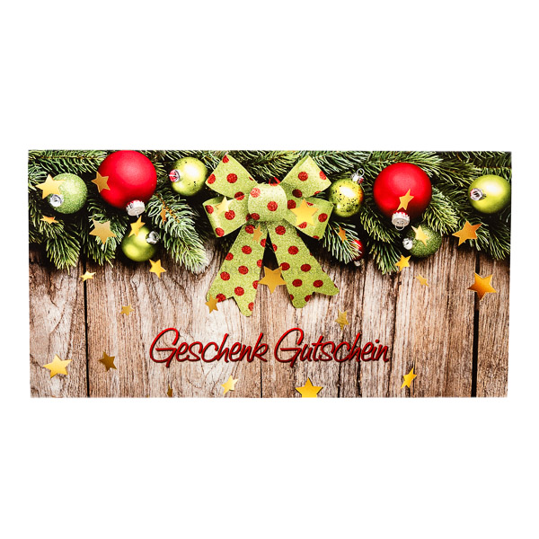 Gutschein inklusive hochwertig bedruckter Multicolor-Geschenkgutscheinkarte mit glänzendem Weihnachtsmotiv und Umschlag.