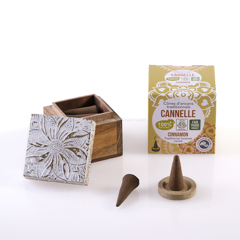 Indische Räucherkegel mit einer kleinen gold- oder silberverzierten Holzbox aus Mangoholz zum Aufbewahren. Mit den indischen Räucherkegeln "Alte Tradition" von Les Encens du Monde verbreiten Sie wunderbar angenehme Düfte im Raum. Der Hauch dieser Düfte bringt uns direkt zur reichen Kultur Indiens, der Wiege von Buddhismus und Hinduismus.