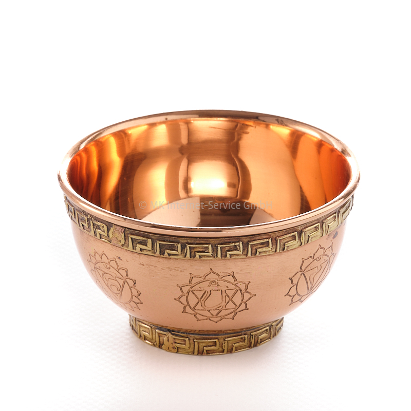 Schöne Kupferschale mit sieben gravierten Chakra-Symbolen zum Räuchern auf Kohle. Diese Schale eignet sich bestens zum Räuchern auf Kohle. Mit Sand befüllt kann die Schale auch als Räucherstäbchenhalter verwendet werden.