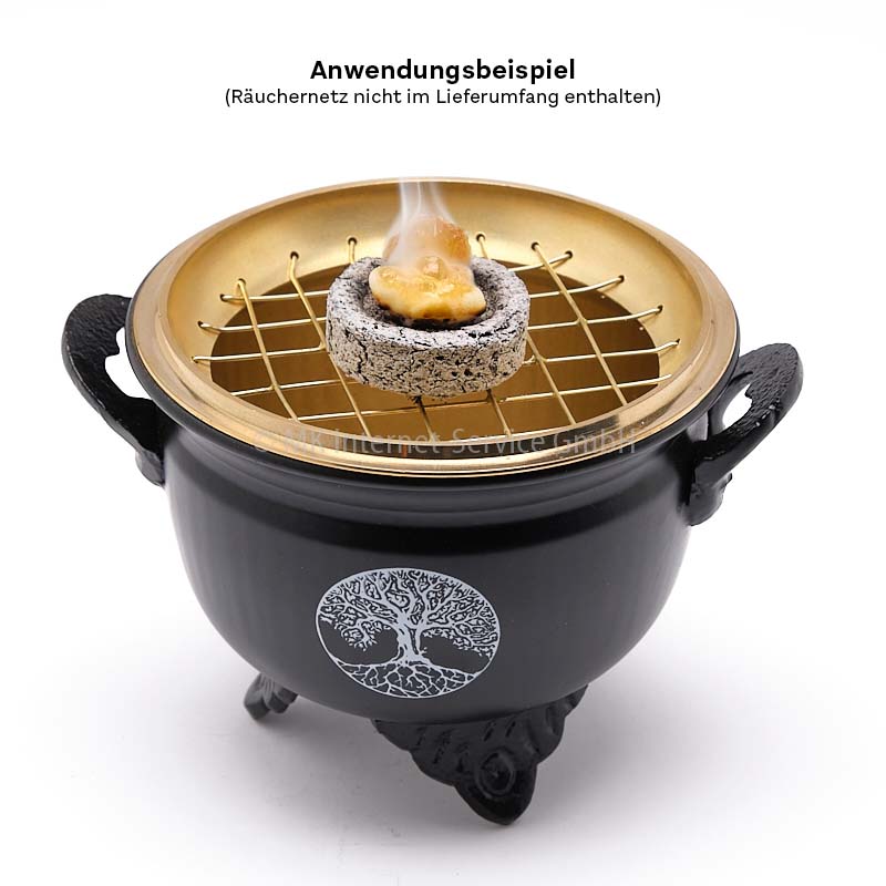 Leichter Hexenkessel mit zauberhaftem Charme. Das filigrane Symbol "Lebensbaum" ist zweifach auf dem Gefäß aufgebracht, jeweils zwischen den Henkeln. Das Gold im Inneren des Räuchergefäßes verleiht der Räucherung etwas Mystisches.