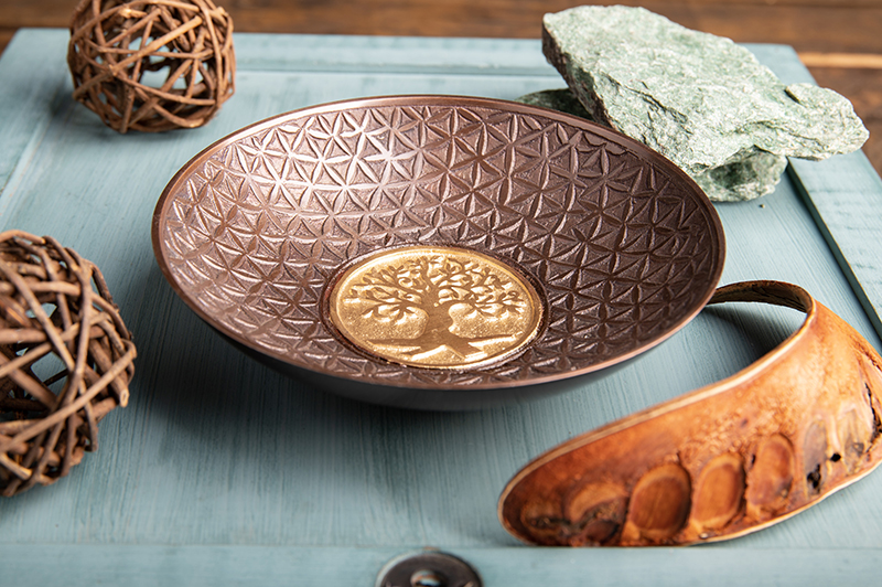 Geschmackvolle große Räucherschale mit Fuß aus Aluminium in Kupfer antik mit goldenem Symbol "Yggdrasil".