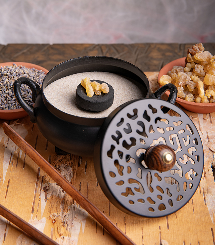- Entzünden Sie eine Räucherkohle und legen Sie diese auf den Sand in die Mitte des Gefäßes.