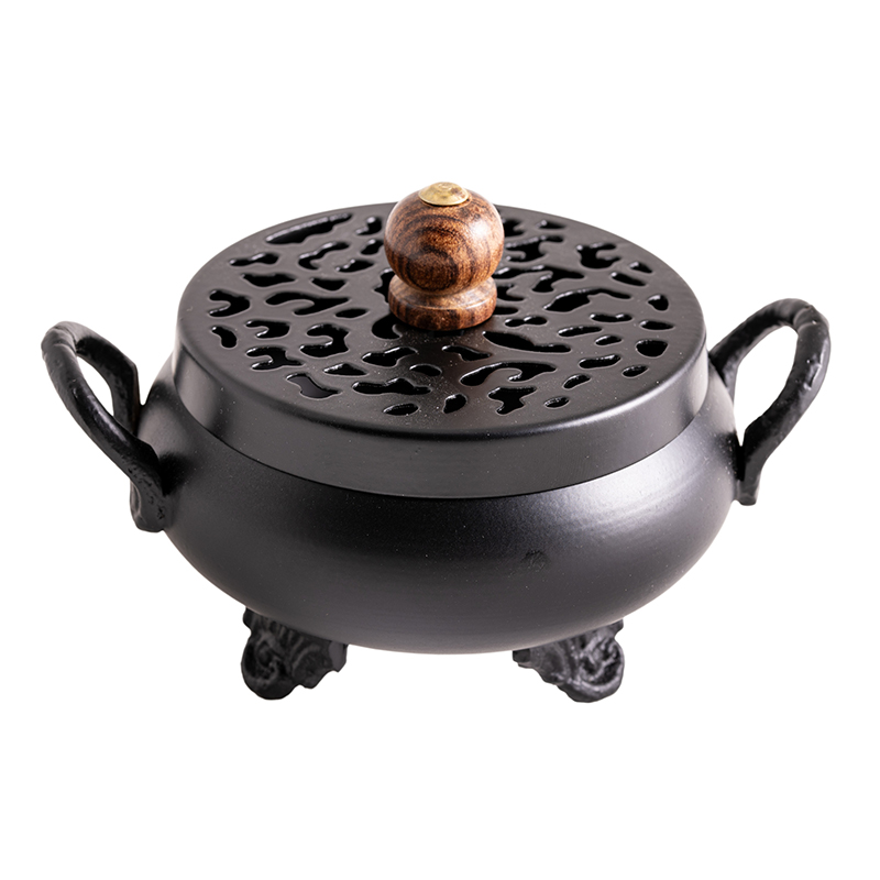Klassisches Räuchergefäß mit Deckel und zwei Griffen aus Eisen schwarz gepudert. Das Metallgefäß hat drei Füßchen und eignet sich bestens zum Räuchern von Harzen und Kräutern auf Kohle. Die feinen Ornamente im Deckel erzeugen mystische Rauchfahnen.