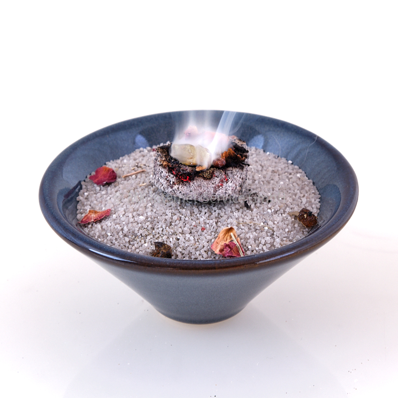 Hübsche, kleine Keramikschale zum Räuchern auf Kohle. Mit Sand oder Granulat befüllt kann die Schale auch als Räucherstäbchenhalter verwendet werden.