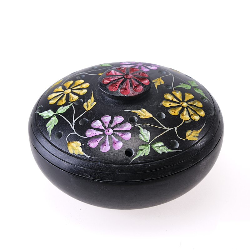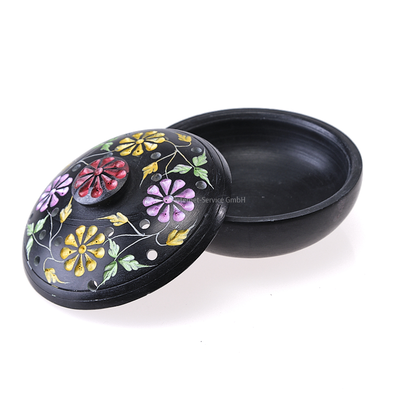 Dekorative Räucherschale mit Deckel. Der Deckel ist mit bunten Blumenintarsien verziert.