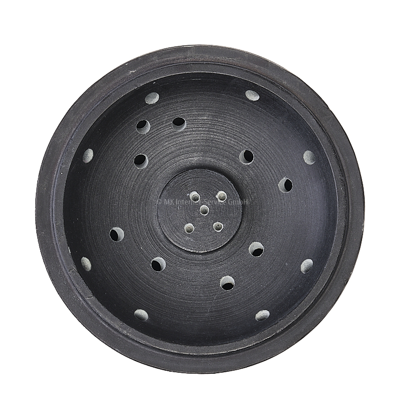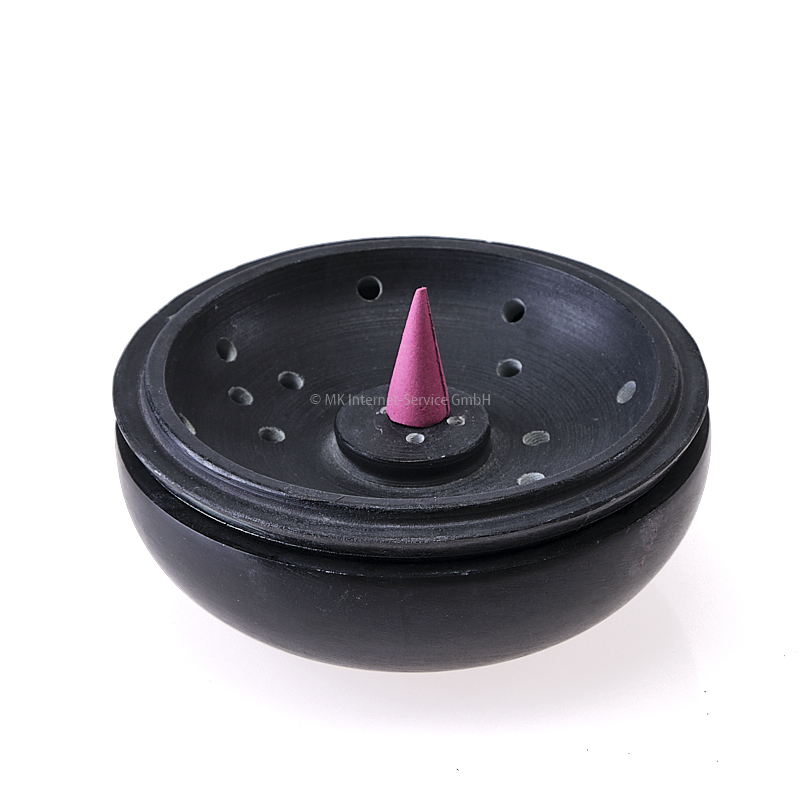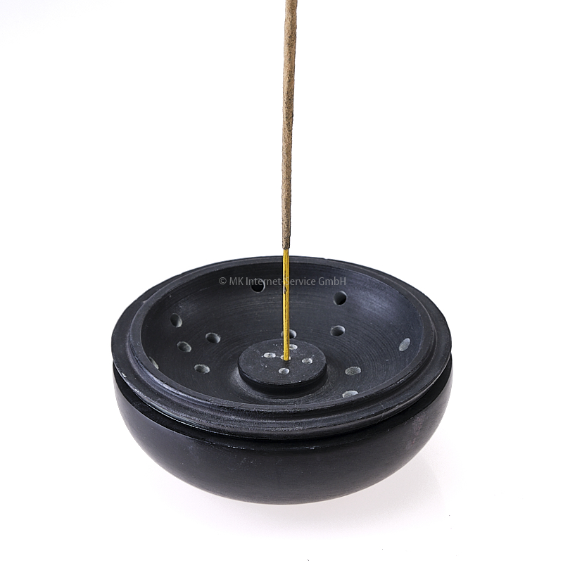 - Oder Sie nutzen den Deckel der Schale als Räucherstäbchenhalter: Dieser hat auf der Unterseite fünf Bohrungen für Räucherstäbchen mit und ohne Trägerholz und wird umgedreht auf die Schale aufgelegt.