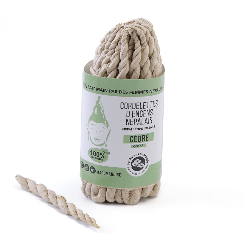 Die Nepalkordeln von Les Encens du Monde werden von Frauen einer Kooperative in Bhaktapur, einer der drei Königsstädte des Kathmandutals in Nepal, von Hand gefertigt. Die Zutaten werden in einem handgeschöpften Blatt Lokta-Papier (Seidelbastpapier) aufgerollt und dann gedreht. So entstehen die typischen Räucherschnüre.