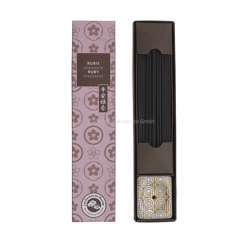 Die Räucherstäbchen werden mit einem passend zum Duft gestalteten Halter aus Porzellan geliefert. Das Motiv des Halters kann variieren.