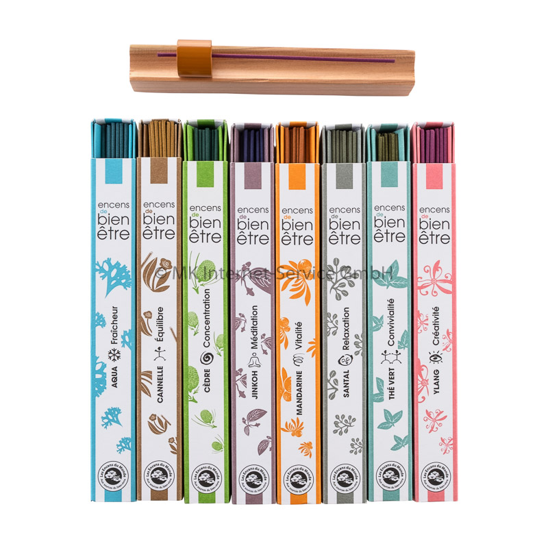 Das Sortiment enthält je eine Schachtel der Wellness-Räucherstäbchen Aqua (Frische), Ylang (Kreativität), Mandarine (Vitalität), Zimt (Balance), Sandelholz (Entspannung), Grüner Tee (Geselligkeit), Zeder (Konzentration) und Jinkoh (Meditation) und den dazu passenden Räucherstäbchenhalter Aromambiance aus Holz.