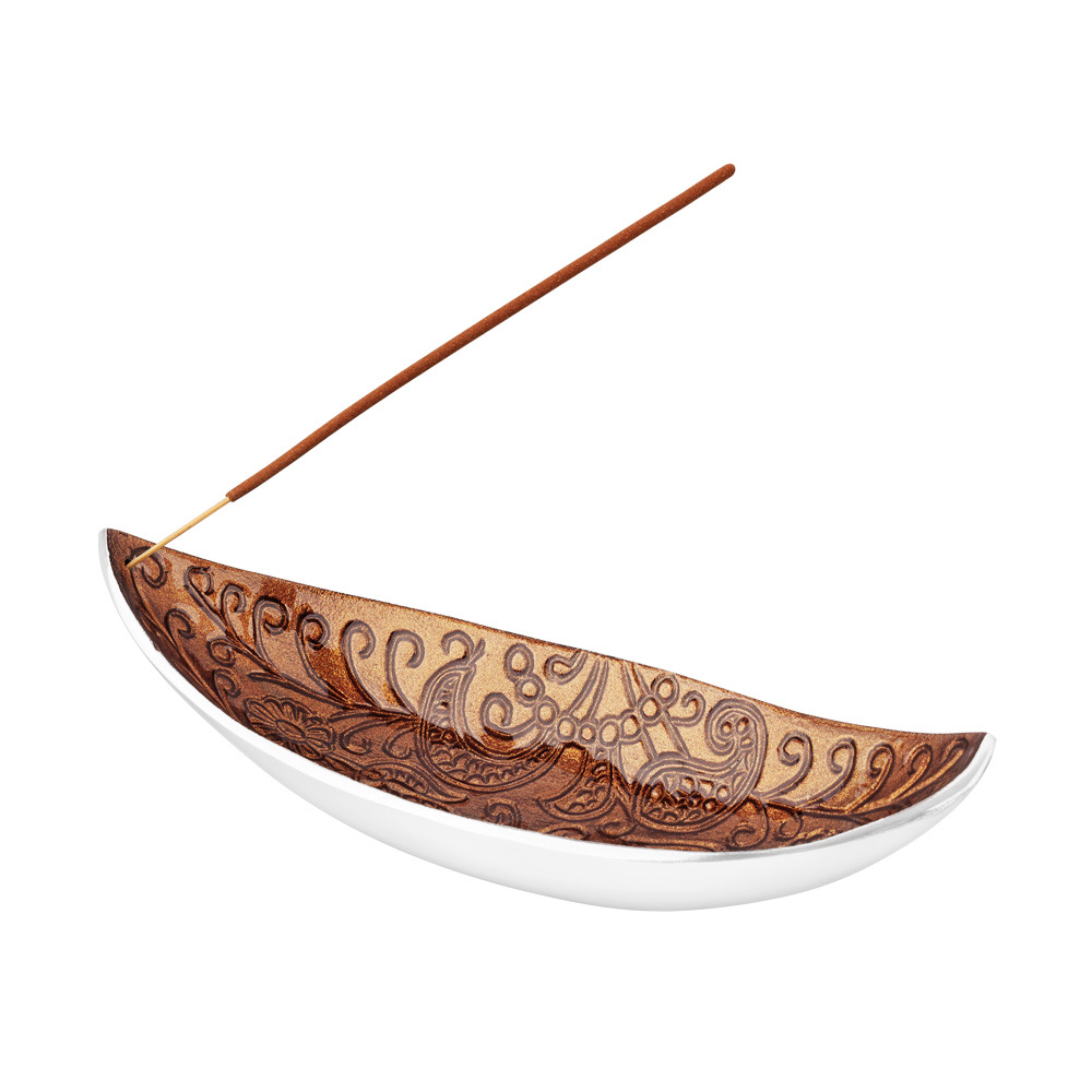 Der Räucherstäbchenhalter HALIPUR besticht durch sein modernes Aluminium-Design. Er ist innen glasiert und verziert mit einem wunderschönen Paisleymuster.