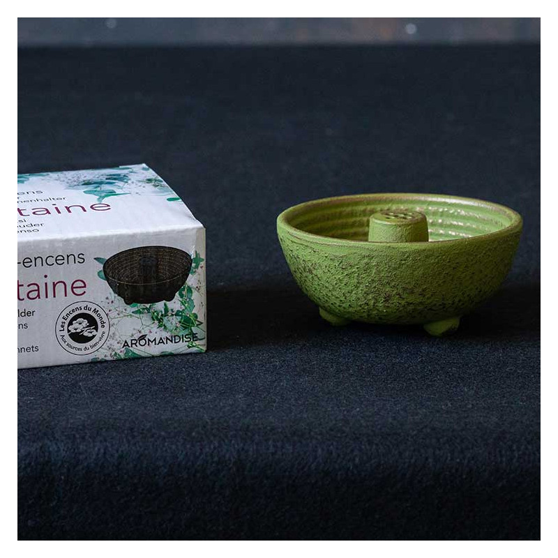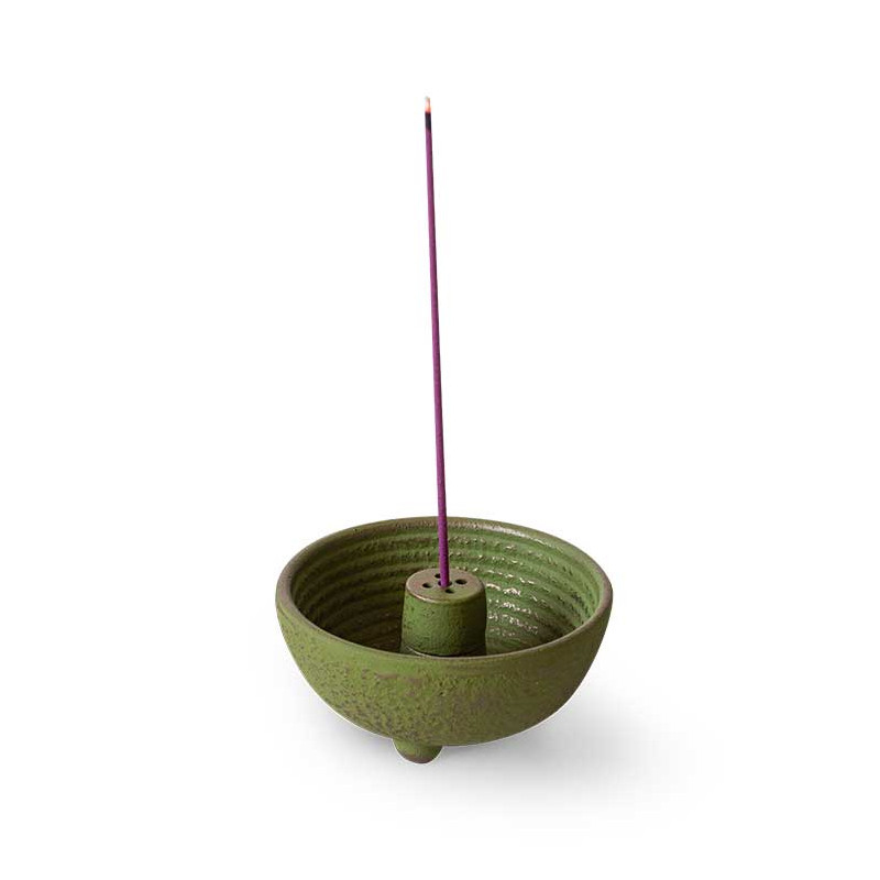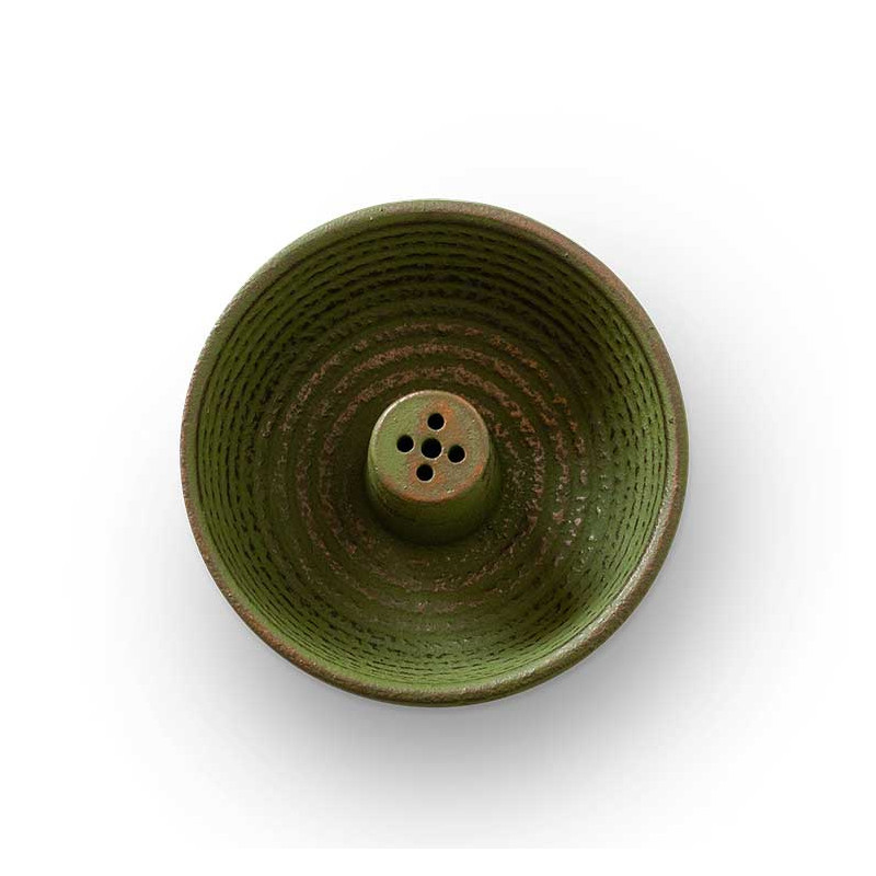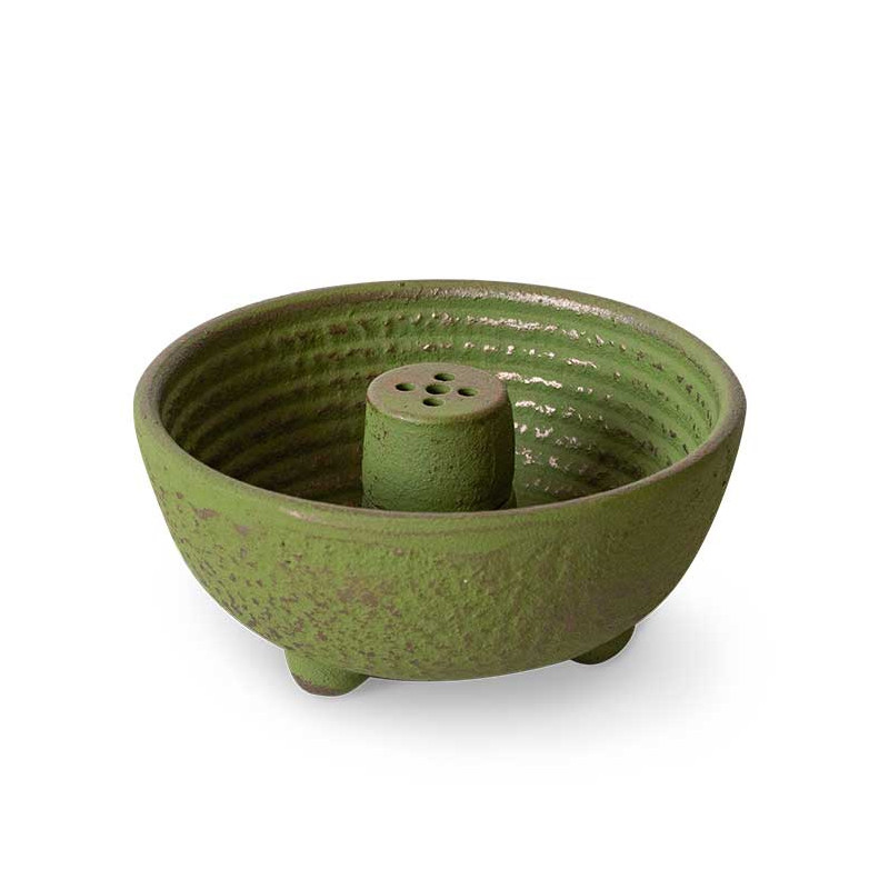 Ein Stilobjekt für Kenner. Grüner, mit Gold verzierter Räucherstäbchenhalter aus gewichtigem Gusseisen mit Einsatz, auf dem fünf Räucherstäbchen, kurz oder lang, gleichzeitig platziert werden können. Das Loch in der Mitte hat einen etwas größeren Durchmesser, indem auch etwas dickere japanische Räucherstäbchen, wie die Zen-Serie von Shoyeido, platziert werden können.