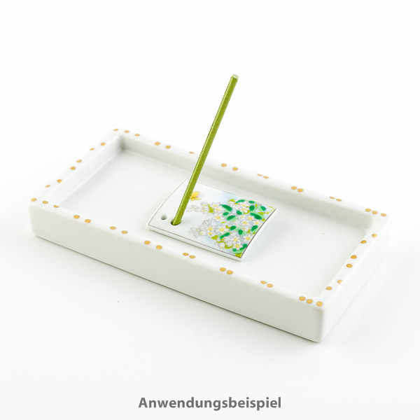 Der rechteckige Halter hat zwei unterschiedlich große Löcher für Räucherstäbchen: Er eignet sich sehr gut für die kurzen, dickeren japanischen Räucherstäbchen wie die Serien "Incense Road" und "Horin" von Shoyeido. Lange dünne Räucherstäbchen können ebenfalls abgebrannt werden, indem man sie einfach in kürzere Teile zerbricht. Der Räucherstäbchenhalter kann auch als Untersetzer für Räucherkegel verwendet werden.