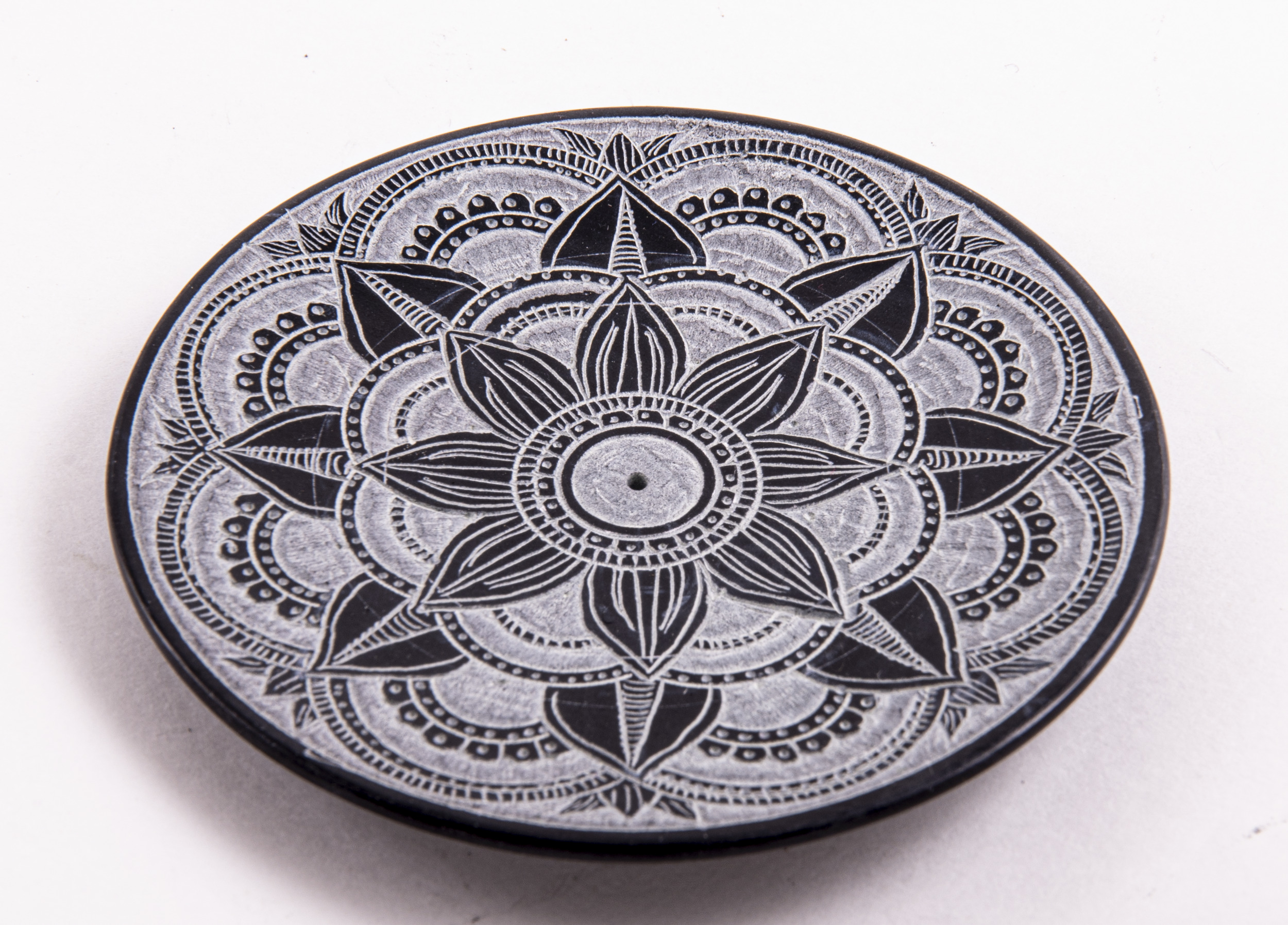 Wunderschöne indische Handwerkskunst mit einem kunstvollen Mandala-Muster. Die feinen Linien werden auf dem Speckstein von Hand graviert.