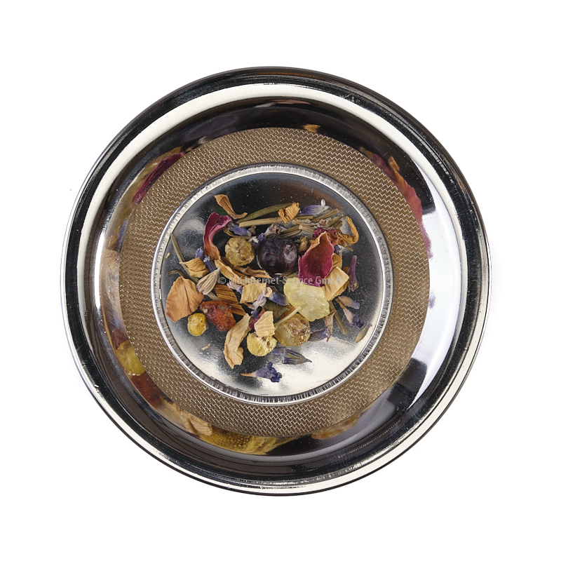Beim Räuchern von Räucherharzen wie Weihrauch, Benzoe, Myrrhe etc. auf einem Räucherstövchen mit Sieb können sich die Harze in das Sieb einbrennen. Um dies zu verhindern, legen Sie einfach diese Metallscheibe auf das Sieb und platzieren darauf Ihr Räucherwerk. Auch besonders fein gemahlene Räuchermischungen können so sicher geräuchert werden.