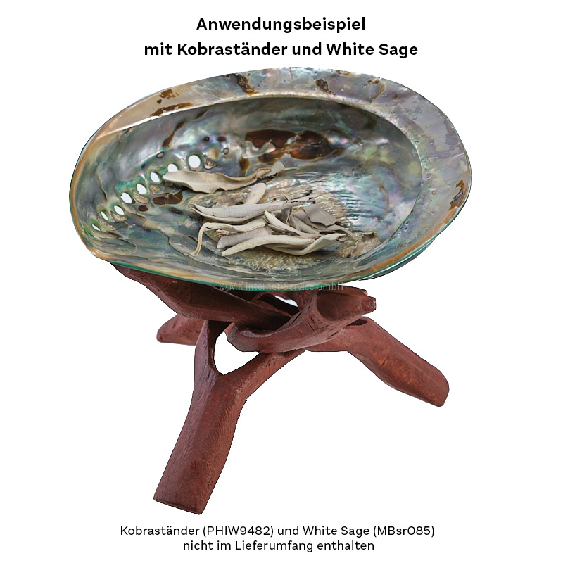 Das Smudgen ist ein alter indianischer Brauch, bei dem man ein Kräuterbündel (Smudge Bundle) und/oder duftende Hölzer wie Weißen Salbei (White Sage) und Palo Santo in der Abalone-Schale verglühen lässt. Dieser Brauch ist oft Teil einer rituellen Zeremonie oder um das Haus und andere Räume energetisch zu reinigen. Die natürlichen Löcher in der Schale sorgen für die Luftversorgung.