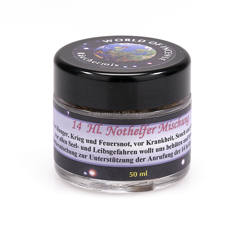 Räuchermischung ohne Weihrauch zur Unterstützung der Anrufung der vierzehn heiligen Nothelfer. Die vierzehn Nothelfer sind Heilige aus dem zweiten bis vierten Jahrhundert, von denen alle bis auf den Heiligen Ägidius als Märtyrer starben: