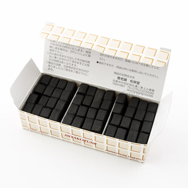 Die japanischen Räucherkohlewürfel 'Miyakozumi' von Shoyeido sind aus Bambus hergestellt. Sie sind leicht entzündbar (nicht selbstzündend), haben keinen Eigenduft und sind vielseitig einsetzbar.