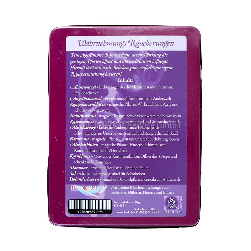 Das Räuchersortiment "Wahrnehmung" enthält fein abgestimmte Räucherstoffe, deren Wirkung die geistigen Pforten öffnet und die unsere Intuition beflügeln. Mit diesem Räuchersortiment aus naturreinen Kräutern, Harzen und Blüten können Sie nach Belieben ganz einfach Ihre eigene Räuchermischung kreieren!