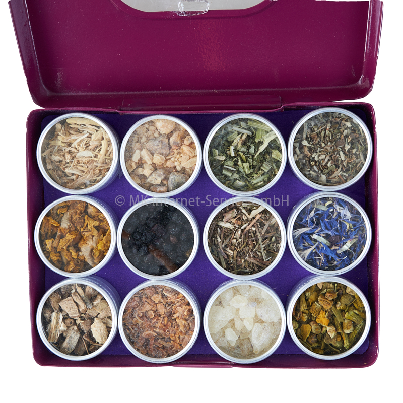 12 Döschen mit naturreinen Kräutern, Harzen und Blüten in einer hübschen Metallbox
