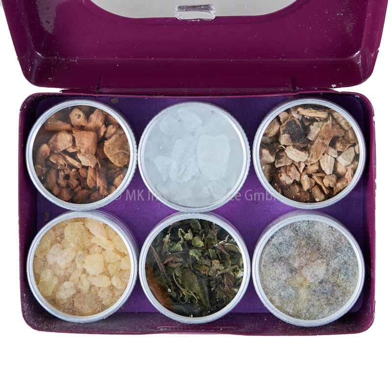 6 Döschen mit naturreinen Kräutern und Harzen in einer hübschen Metallbox