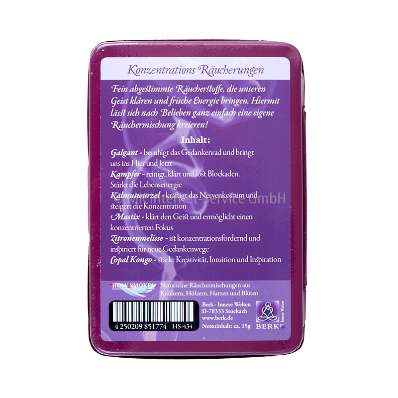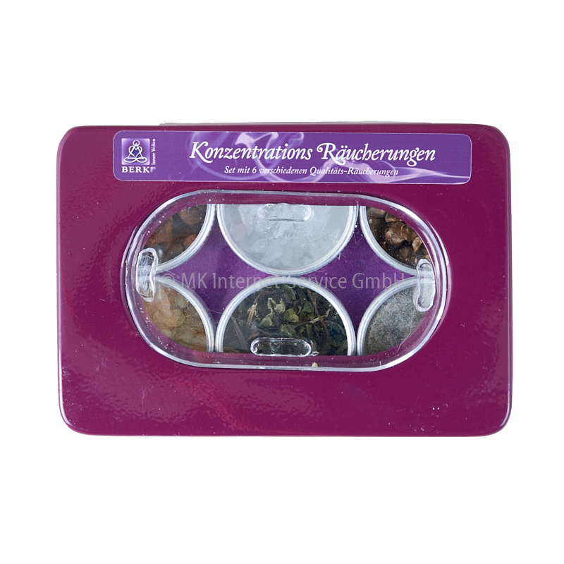 Das Räuchersortiment "Konzentration" enthält fein abgestimmte Räucherstoffe, die unseren Geist klären und frische Energie bringen. Mit diesem Räuchersortiment aus naturreinen Kräutern, Harzen, Hölzern und Blüten können Sie nach Belieben ganz einfach Ihre eigene Räuchermischung kreieren!