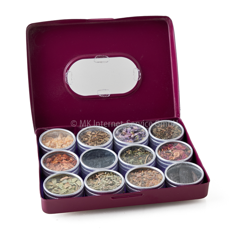12 Döschen mit naturreinen Kräutern, Harzen und Blüten in einer hübschen Metallbox