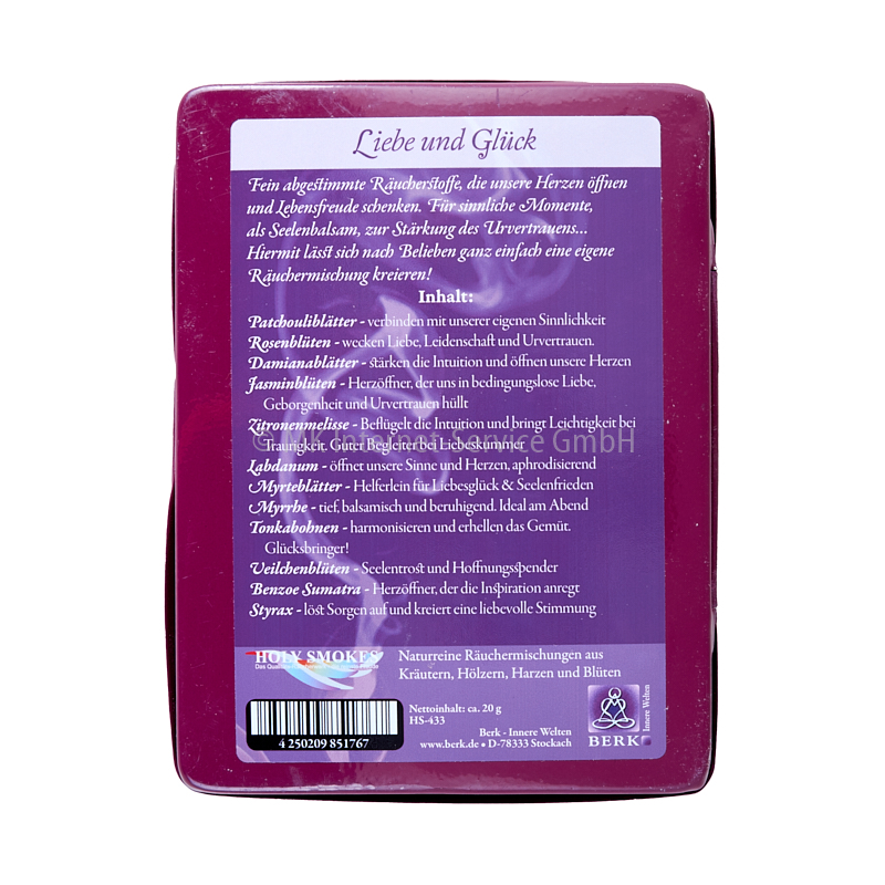 Das Räuchersortiment "Liebe und Glück" enthält fein abgestimmte Räucherstoffe, die unsere Herzen öffnen und Lebensfreude schenken. Für sinnliche Momente, als Seelenbalsam, zur Stärkung des Urvertrauens. Mit diesem Räuchersortiment aus naturreinen Kräutern, Harzen, Hölzern und Blüten können Sie nach Belieben ganz einfach Ihre eigene Räuchermischung kreieren!