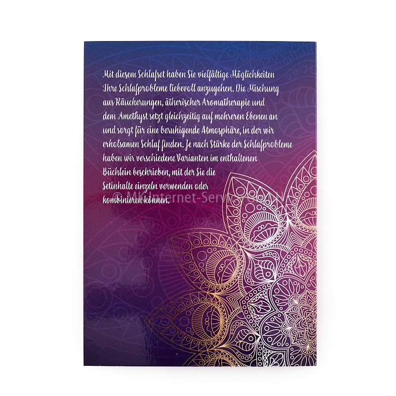 Mit diesem liebevoll gestalteten Schlafset haben Sie vielfältige Möglichkeiten, Ihre Schlafprobleme liebevoll anzugehen. Die Mischung in diesem Set aus Räucherungen, ätherischer Aromatherapie und dem Amethyst setzt gleichzeitig auf mehreren Ebenen an und sorgt für eine beruhigende Atmosphäre, in der wir erholsamen Schlaf finden. Je nach Stärke der Schlafprobleme haben wir verschiedene Varianten im enthaltenen Büchlein beschrieben, mit der Sie die verschiedenen Set-Inhalte einzeln verwenden oder kombinieren können.