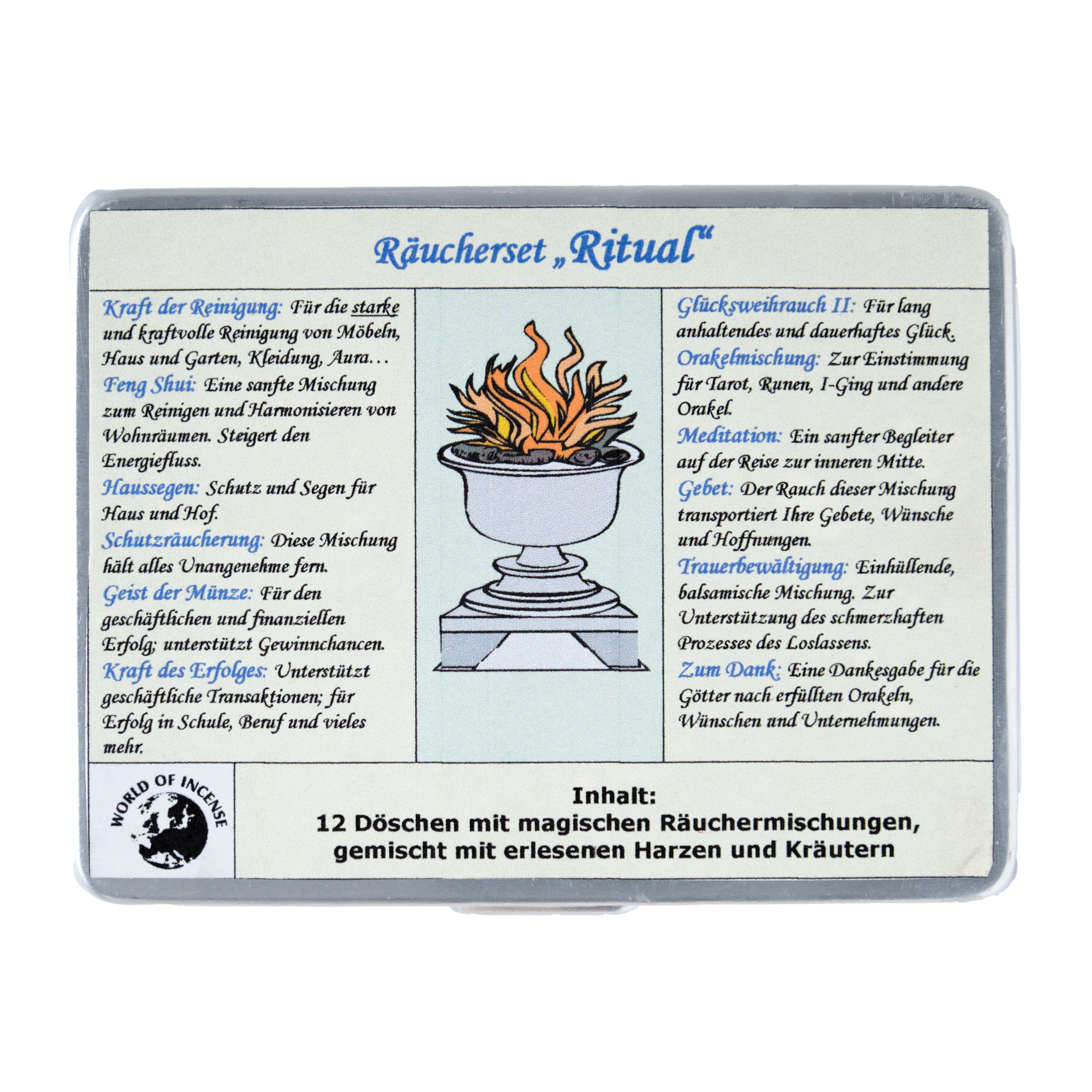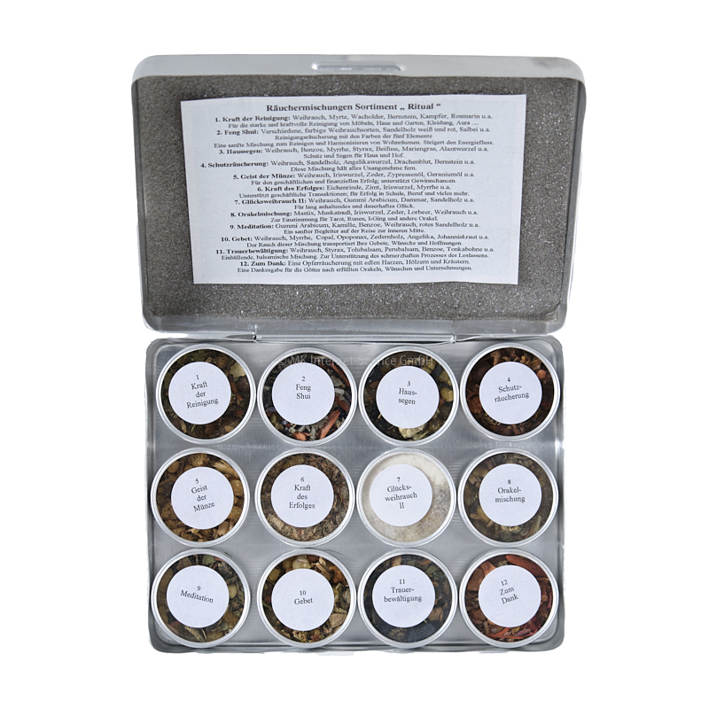 Geschenkset mit zwölf Döschen Räucherwerk in einer Alubox. Die Döschen enthalten magische Räuchermischungen mit erlesenen Harzen und Kräutern. Jedes Döschen ist einzeln nummeriert. Weiterführende Texte und Inhaltsangaben befinden sich im Deckel der Box und auf der Außenverpackung.