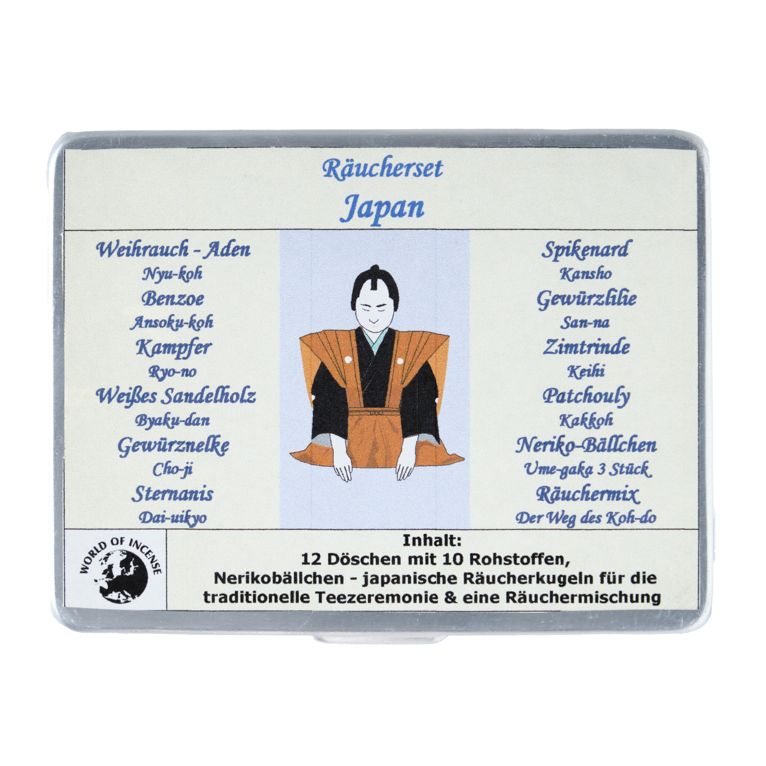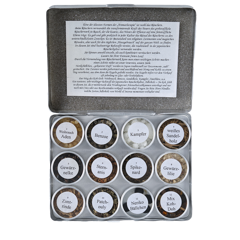 Geschenkset mit zwölf Döschen Räucherwerk in einer Alubox. In diesem Set sind hochwertige Rohstoffe vereint, die traditionell in der japanischen Räucherkultur verwendet werden. Sie können sowohl einzeln, als auch kombiniert verräuchert werden.