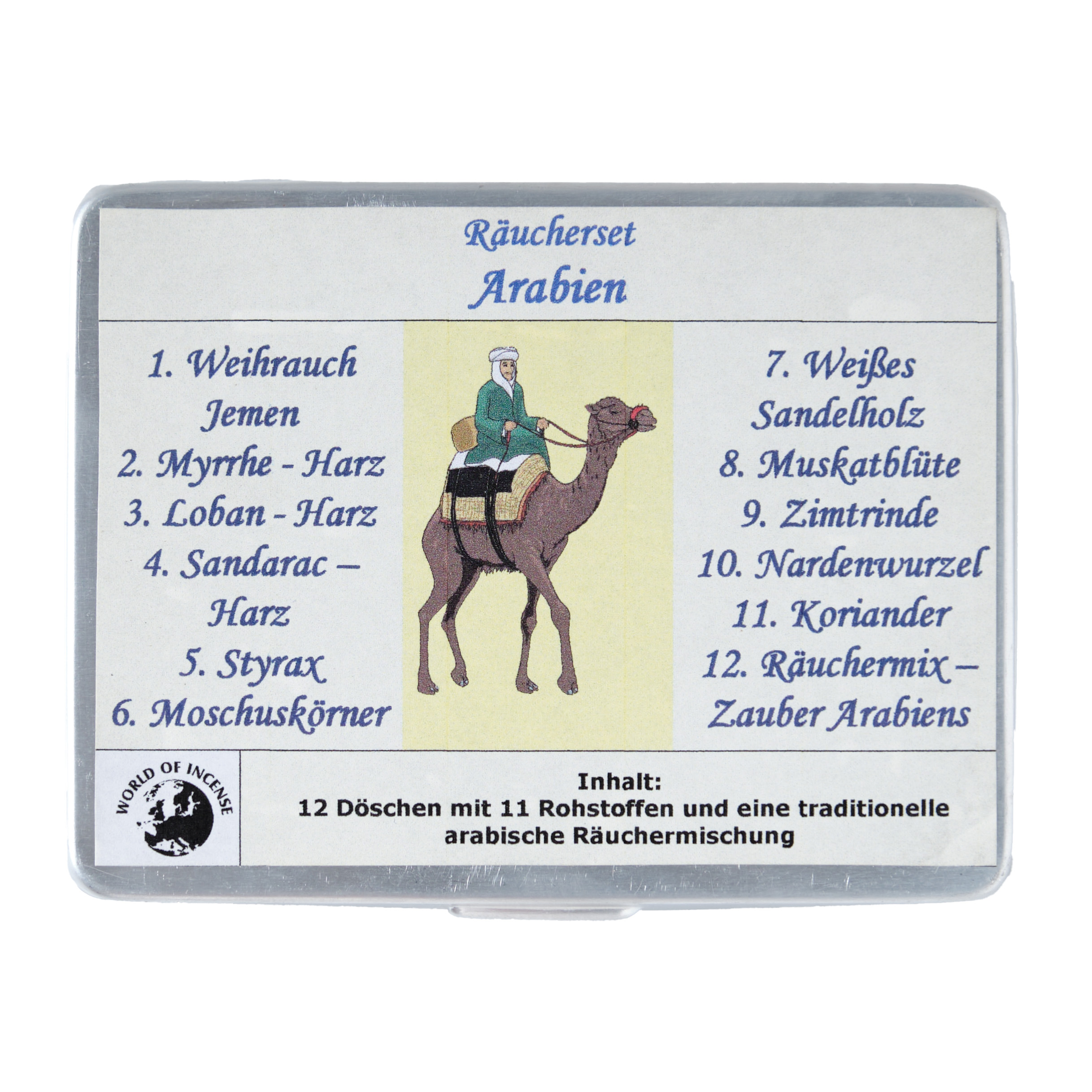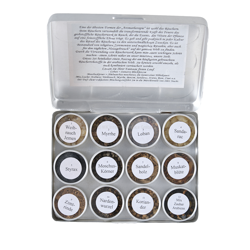 Geschenkset mit zwölf Döschen Räucherwerk in einer Alubox. Dieses Set beinhaltet eine Auswahl der am häufigsten gebrauchten Räucherrohstoffe in der arabischen Welt. Sie können sowohl einzeln, als auch kombiniert verräuchert werden. Die Döschen enthalten elf Rohstoffe und eine traditionelle arabische Räuchermischung. Lassen Sie Ihrer Fantasie freien Lauf.