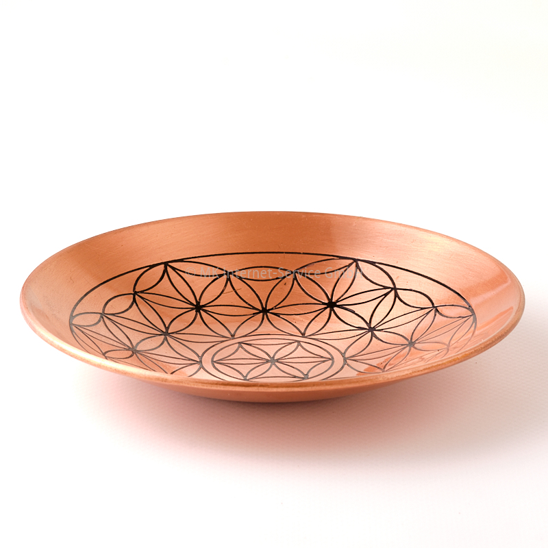 Dekorative Kupferschale mit graviertem Symbol der Blume des Lebens. Mit Samt an der Unterseite zum Schutz der unterliegenden Oberfläche. Die Blume des Lebens gilt als die symbolische Darstellung der heiligen Geometrie des Universums - der Grundlage sowie Existenz von allem, was ist. Mit diesem Teller wird Ihre Räucherzeremonie gleich in eine hochschwingende Energie gebracht.