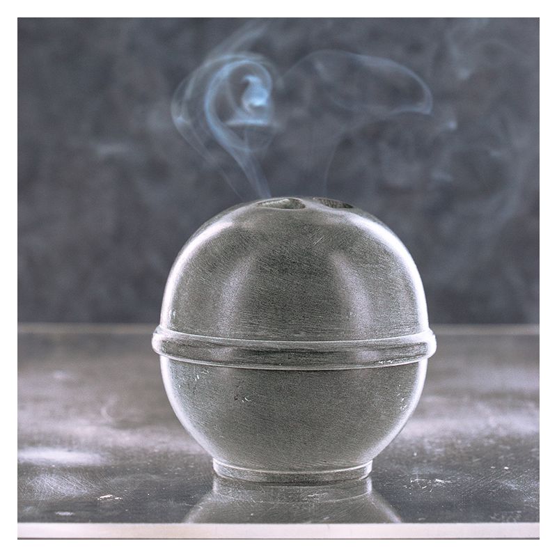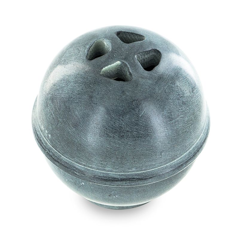 Räucherkegelhalter in Form einer Geode mit Öffnungen, aus denen der Rauch sanft herausquillt. Das Oberteil ist abnehmbar. Der Kegel wird ins Innere des Halters gestellt.