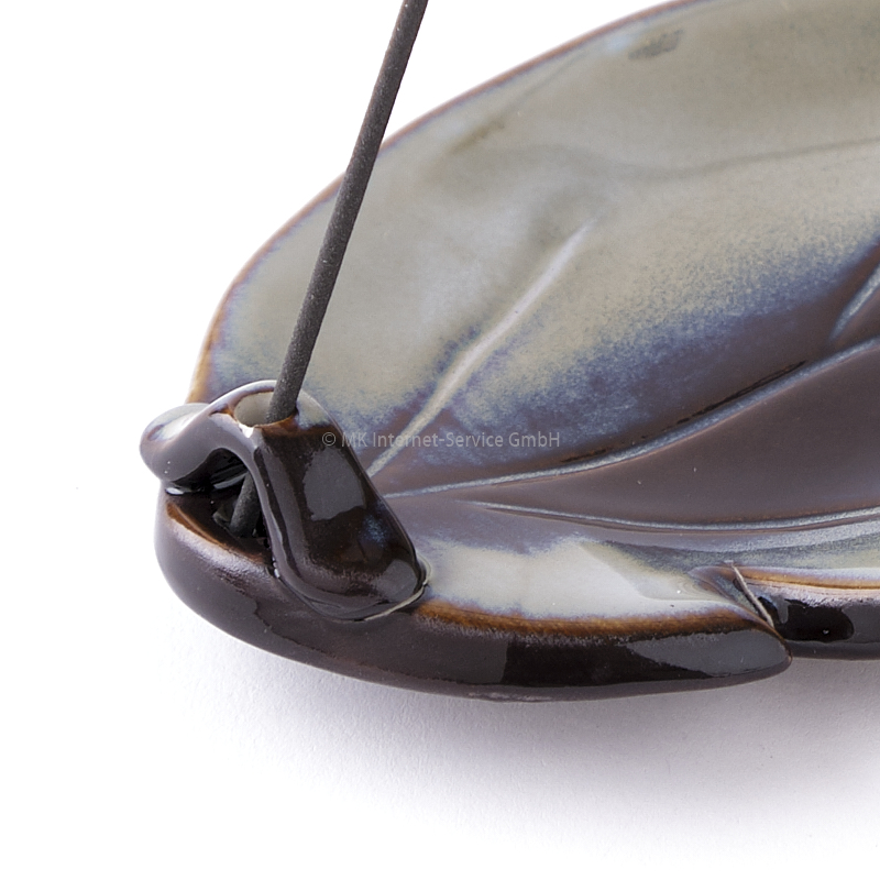 Schöner Räucherstäbchenhalter aus Keramik in Form eines Eichenblatts von Shoyeido. Die glänzende Glasur "Mountain Mist" in schönen Blau-, Grau- und Erdtönen erinnert an wolkenverhangene Hügel und fügt dem Räuchererlebnis ein erdiges Element hinzu.