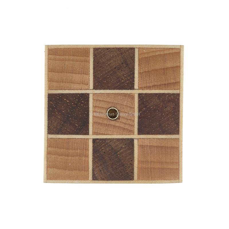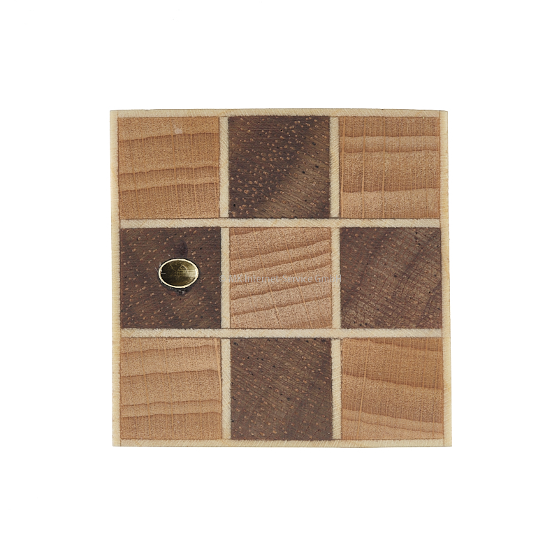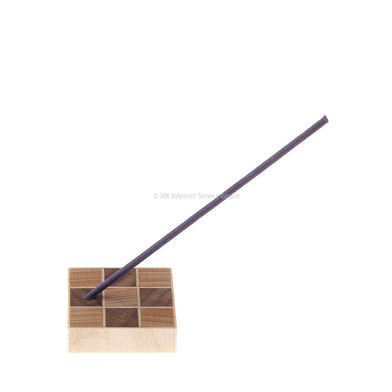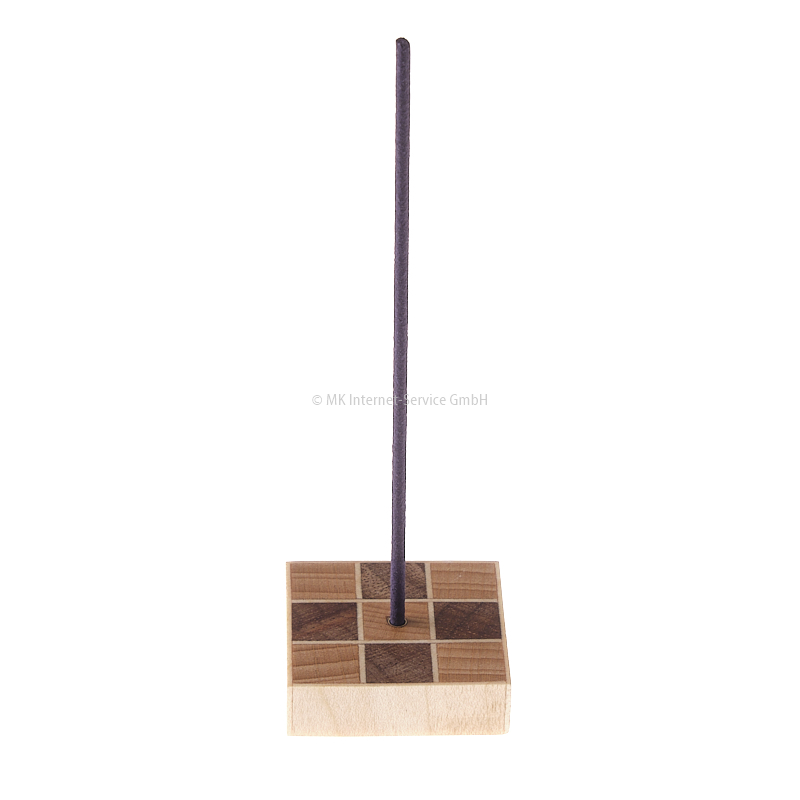 Der Räucherstäbchenhalter wird aus sorgfältig ausgewählten Quadraten verschiedener Holzarten, die unterschiedliche Farbtöne haben, gefertigt. Die Quadrate werden so miteinander kombiniert, dass das kontrastreiche schachbrettartige Muster entsteht.