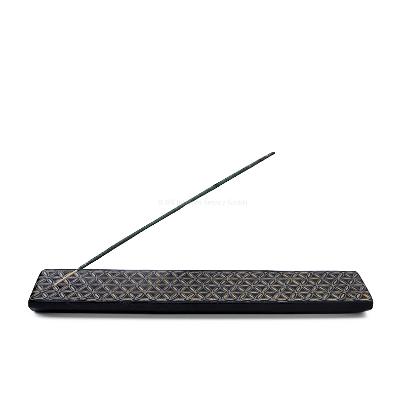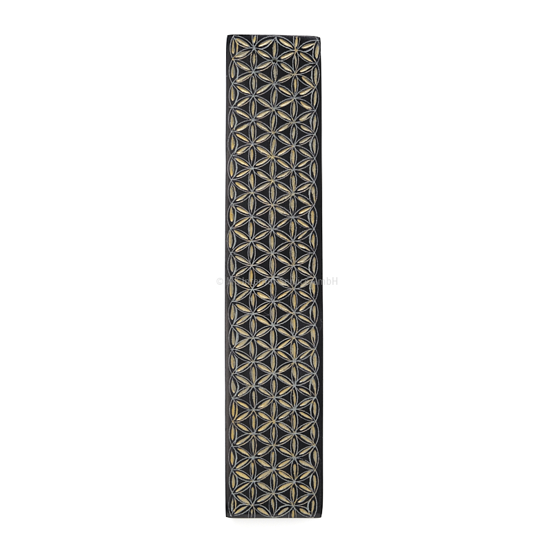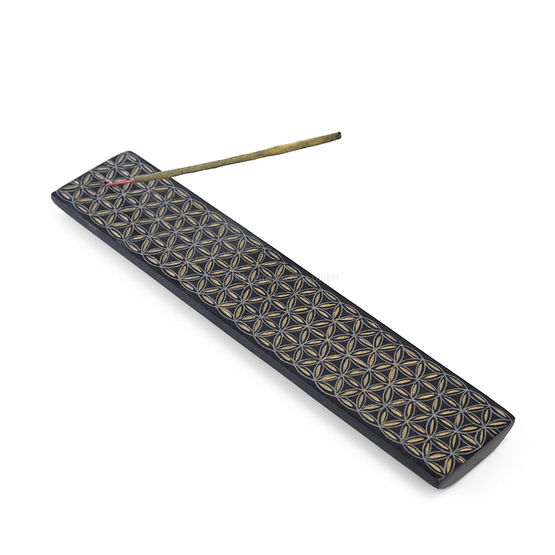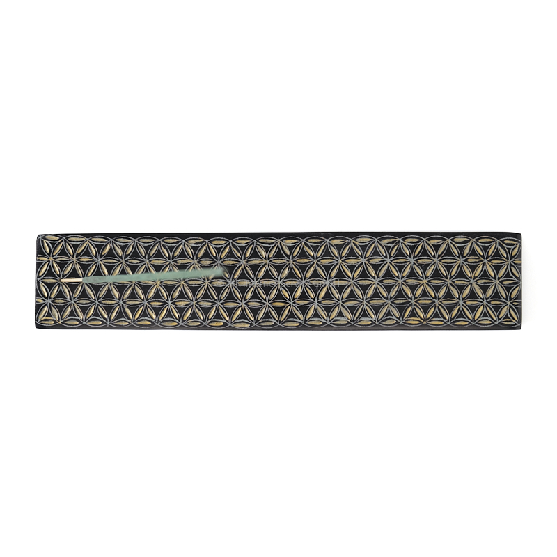 Langer, stilvoll gearbeiteter und solider Räucherstäbchenhalter in Schiffchenform aus Speckstein mit der Blume des Lebens. Für ein zugleich elegantes und energetisches Räuchern. Das goldene Motiv wird von Hand graviert.
