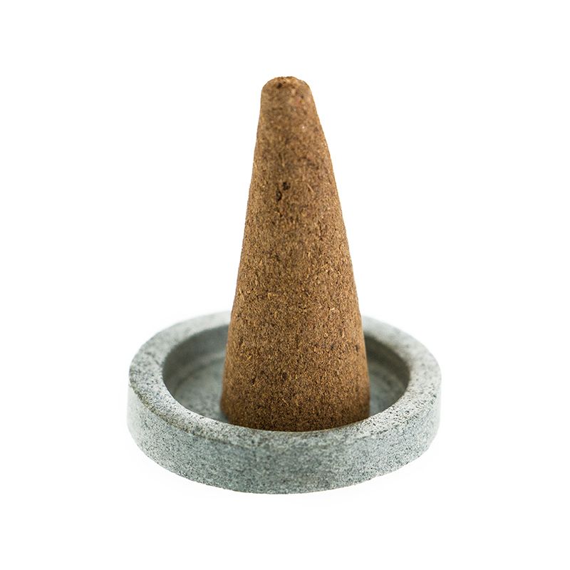 Beruhigende tibetische Räucherkegel nach einer traditionellen Rezeptur von Dr. Dolkar. Stressmildernde Wirkung durch Zeder und Weihrauch (Olibanum), begleitet von traditionellen Zutaten wie Wachholder und Rhododendron.